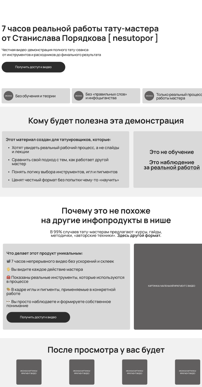 - чётко объясняет ценность продукта: реальный видео-курс «7 часов настоящей работы» без ускорений и фильтров